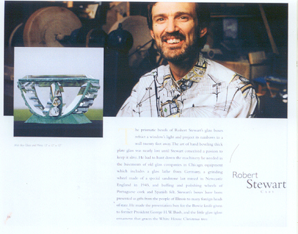 | " The prismatic bevels of Robert Stewart's glass boxes refract a window's light and project its rainbows to a wall twenty feet away. The art of hand beveling thick plate glass was nearly lost until Stewart conceived a passion to keep it alive. He had to hunt down the machinery he needed in the basements of old glass companies in Chicago, equipment which includes a glass lathe from Germany, a grinding wheel made of a special sandstone last mined in Newcastle England in 1906, and buffing and polishing wheels of Portuguese cork and Spanish felt. Stewart's boxes have been presented as gifts from the people of Illinois to many foreign heads of state. He made the presentation box for the Bowie knife given to former President George H.W. Bush at a formal presentation at White House. |